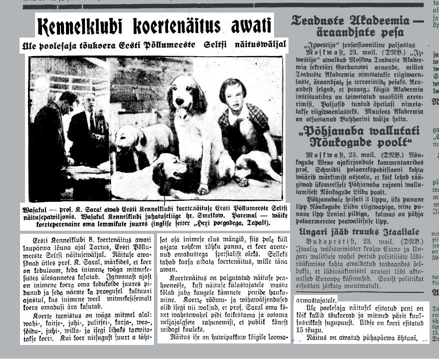 статья НОВАЯ ПОРОДА ОХОТНИЧЬИХ СОБАК В ЭСТОНИИ. газета ВАБА МАА (Свободная страна) 6 МАЯ 1934 ГОДА.